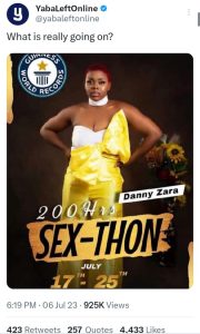 A Cameroonian woman named Danny Zara has announced plans for a 200-hour sex marathon.