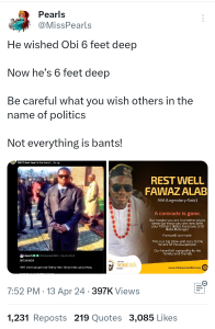 But guess what? Lengdrxx Alabi wished Labour Party Presidential Candidate, Peter Obi dead on Twitter last year but he recently died yesterday as posted by a core Obidient, Pearl (@MissPearl) on her X handle.