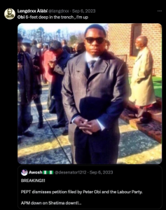 Such was the case when X user, Lengdrxx Alabi made a post on his X handle on the 6th of September 2023 where he said and I quote: “Obi 6 feet deep in the trench, am up”.