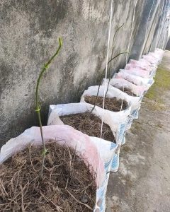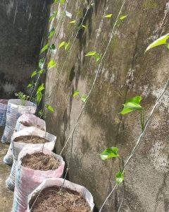 As the yam plants begin to sprout leaves, Step 6 involves providing support for their upward growth. Attach sticks to the sacks to create a trellis-like structure, allowing the leaves to climb and maximize sunlight exposure.