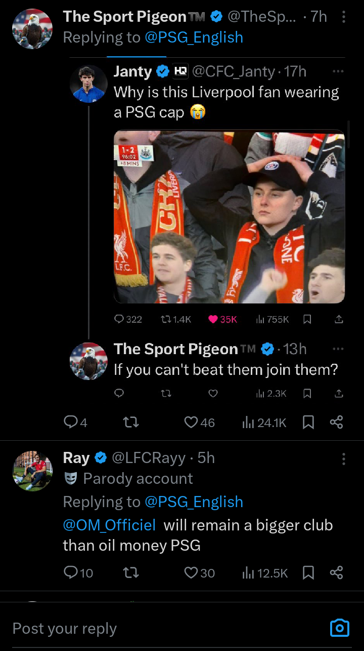 One Liverpool fan, seemingly unfazed by recent events, was spotted at Wembley wearing a PSG cap—an image that quickly went viral. The bold fashion choice caught the attention of PSG’s official admin on X (formerly Twitter), who wasted no time in delivering a brutal response: